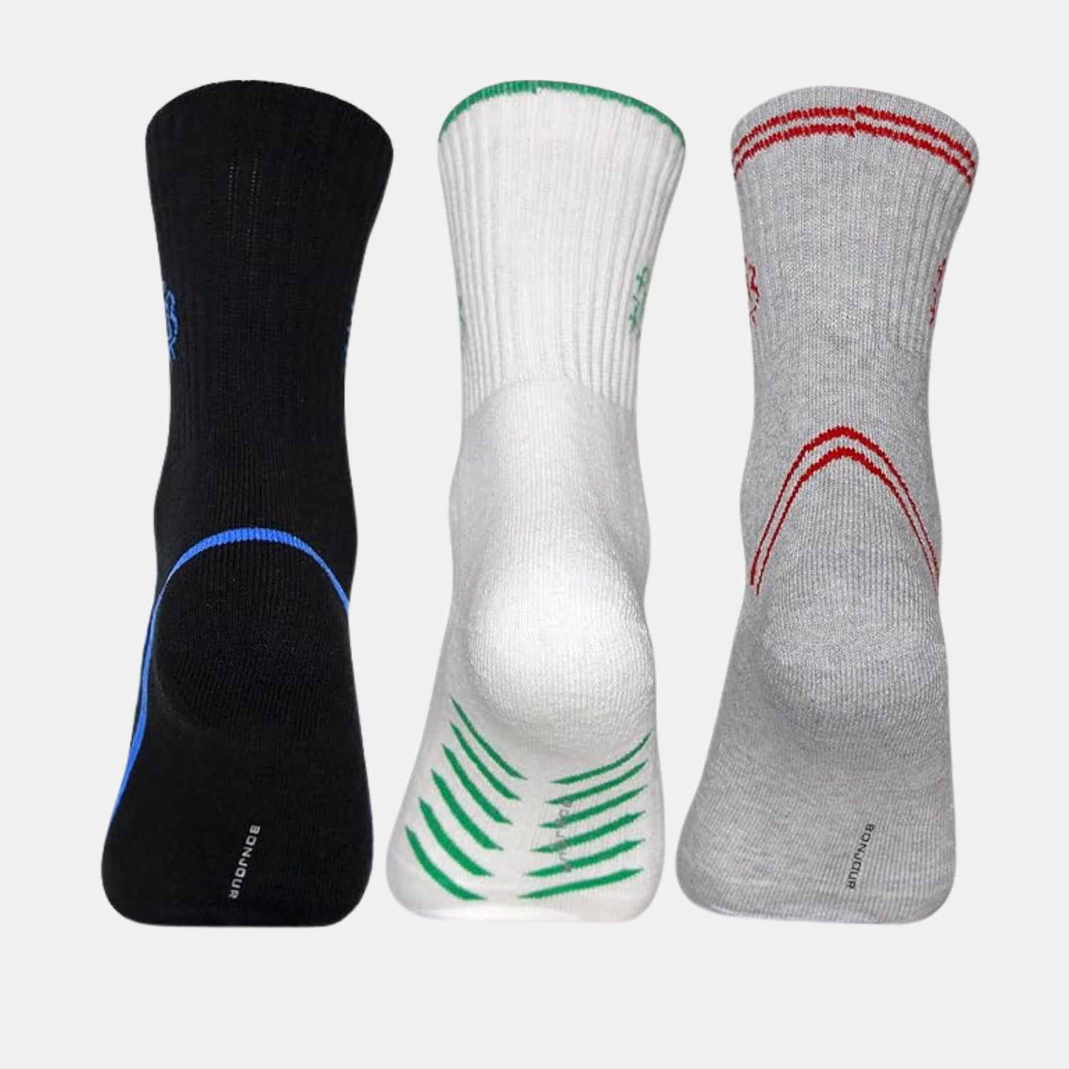 Bonjour Men's Cushioned Multicolored Sports Crew Length Socks with a different design, pattern and color to fulfil your various needs in one pack. These Socks club well to compliment your dressing for any purpose like going out for party picnic, in-office or in a club. These Bonjour Casual and Sports Socks are crafted using extremely soft Cotton blend Fabric. Your feet Relax in these super soft designed Socks. They are designer creation in classic and vibrant color to Groom your look. Socks have a gentle grip and light feel on the skin. So these socks suit well with any pattern Shoes.