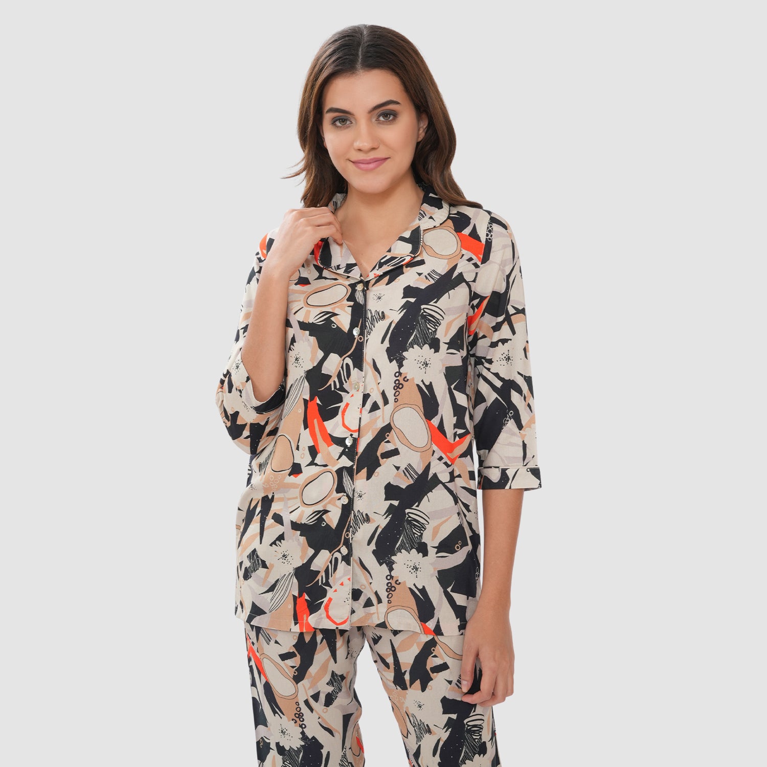 Bonjour Women's Floral Print Lounge Wear Set. Crafted from soft, breathable fabric, this floral-printed set is perfect for relaxing at home or enjoying a restful night. Designed with a relaxed fit and a classic button-down top, it combines everyday comfort with a touch of elegance — ideal for lounging or sleep.