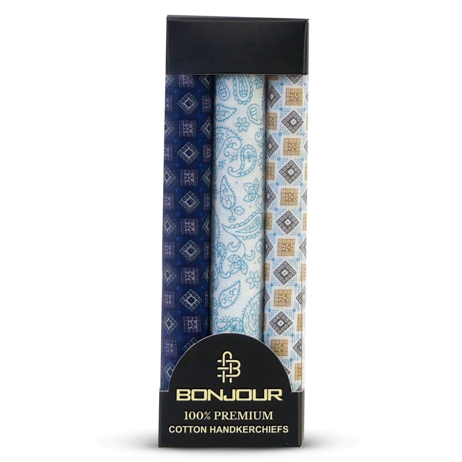 Bonjour Silcora Designer Cotton Handkerchiefs, crafted from soft and breathable cotton, offer a smooth feel and elegant look. The stylish printed patterns add a refined touch, making them perfect for both office and casual use. Designed to blend comfort with sophistication, these handkerchiefs bring class to your everyday essentials. Whether for daily use or gifting, this set adds a hint of luxury and charm that stands out effortlessly  a perfect pick for those who value quality and style in every detail.