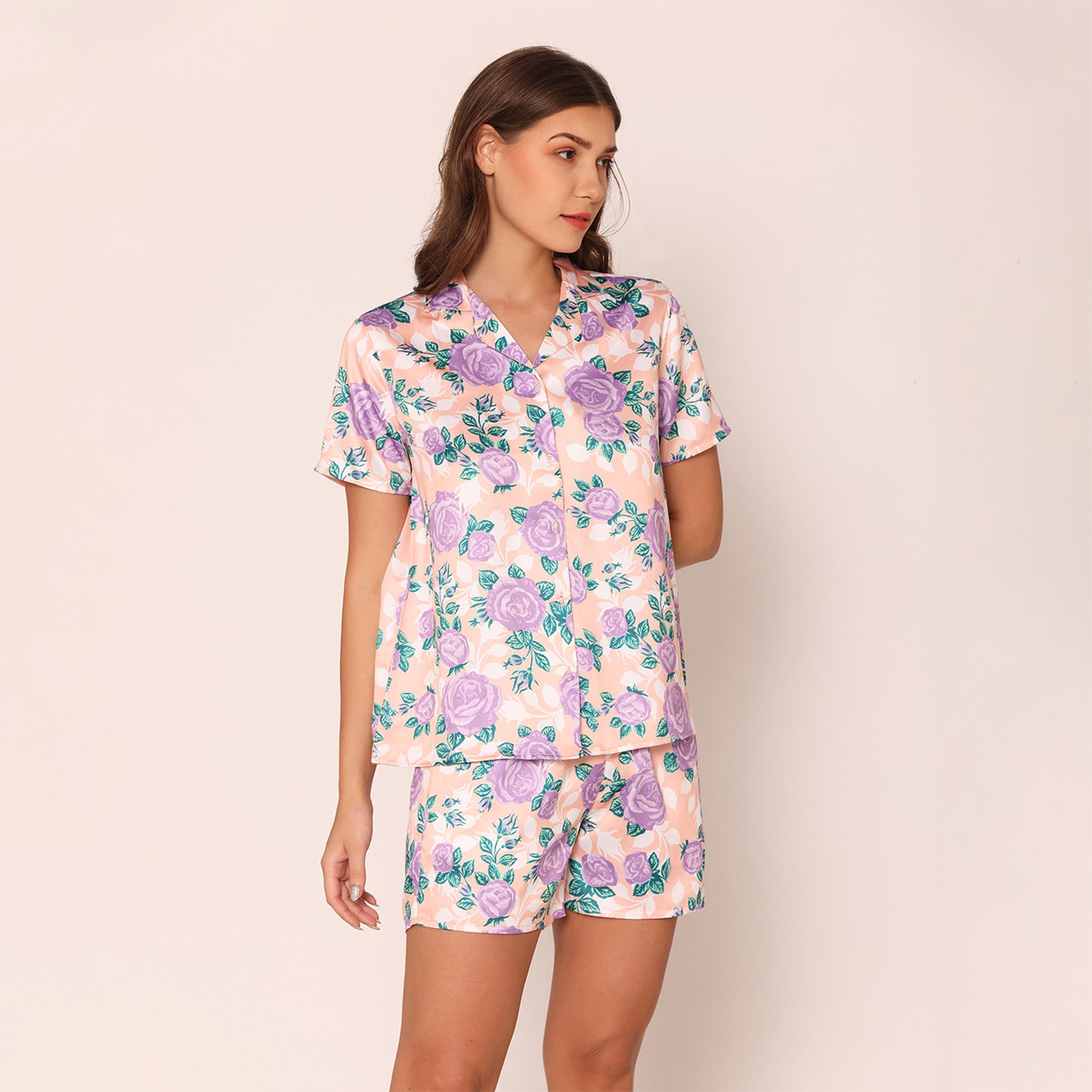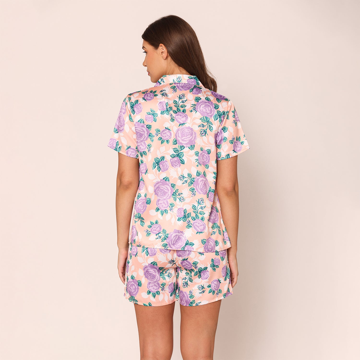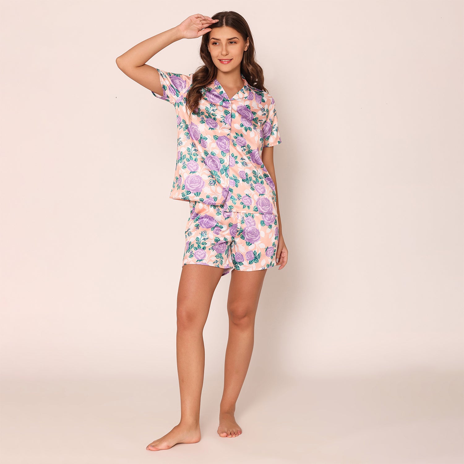 Women's Satin Rosebuds Night Suit Set of Shirt & Shorts